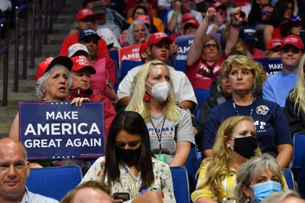 6月20日,特朗普的支持者参加在美国俄克拉何马州塔尔萨市举行的竞选集会。这是特朗普在美国新冠疫情暴发后首场竞选集会。(法新社)
