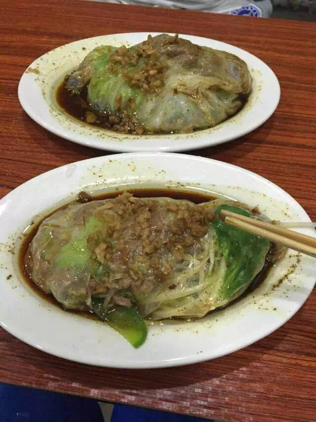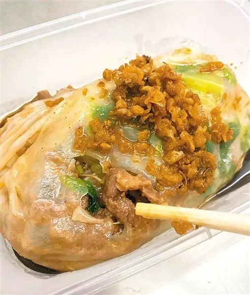 肠粉皮薄接近透明,再淋上特制的风味酱汁,原本透明的粉皮也被染上了颜色,口感也变得顺滑。隔着这层薄薄的粉皮还能看到肠粉里面的配料极其丰富,翠绿的蔬菜搭配着配料透过粉皮展现出来。