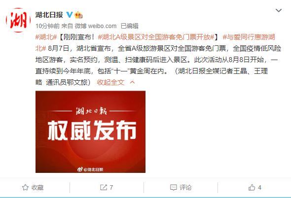 8月7日,湖北省政府宣布,启动“与爱同行 惠游湖北”旅游惠民活动,从8月8日始至今年年底,包括“十一”黄金周在内,全省A级景区对全国游客免门票开放。全国疫情低风险地区游客,实名预约,测温、扫健康码后均可免门票进入景区。