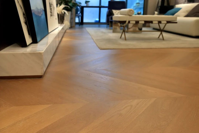 地板采用更费人工、物料的鱼骨拼地板,耐看且有品质;客厅背景墙和墙纸均为交付标准。