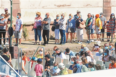 5日,人们在法国东部城市斯特拉斯堡市中心戴着口罩乘坐游船。新华社发