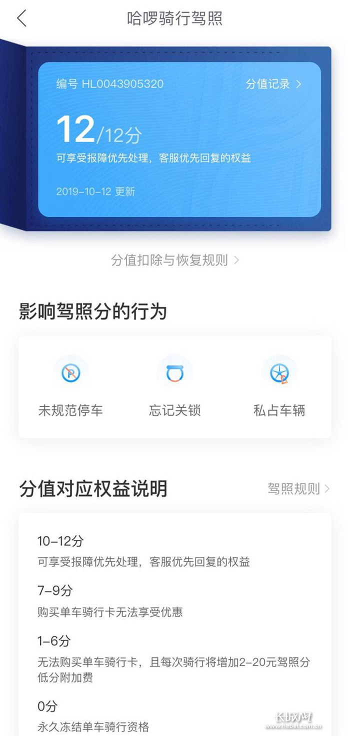 据了解,哈啰出行新版的“骑行驾照”满分为 12 分,分为A到F六个等级。其中,A等级为“优秀”,对应分数10至12分,此等级范围内的用户享有更多骑行优惠、优先客服接入、优先处理报障等权益。如果用户的骑行驾照分数被扣到了0分即“失信”等级,将被禁止使用。