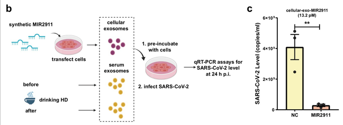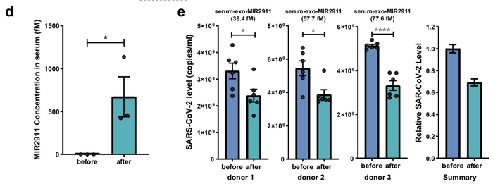 接下来,研究评估了在金银花汤剂中可吸收的MIR2911对SARS-CoV-2复制的抑制作用。因为金银花汤剂中可吸收的MIR2911是通过循环系统中的外泌体传递到肺部的,因此研究团队用了志愿者血清进行体外细胞实验。结果强烈表明,服用金银花汤剂的志愿者可以充分吸收MIR2911,并且吸收的MIR2911可以显著阻止SARS-CoV-2的复制。
