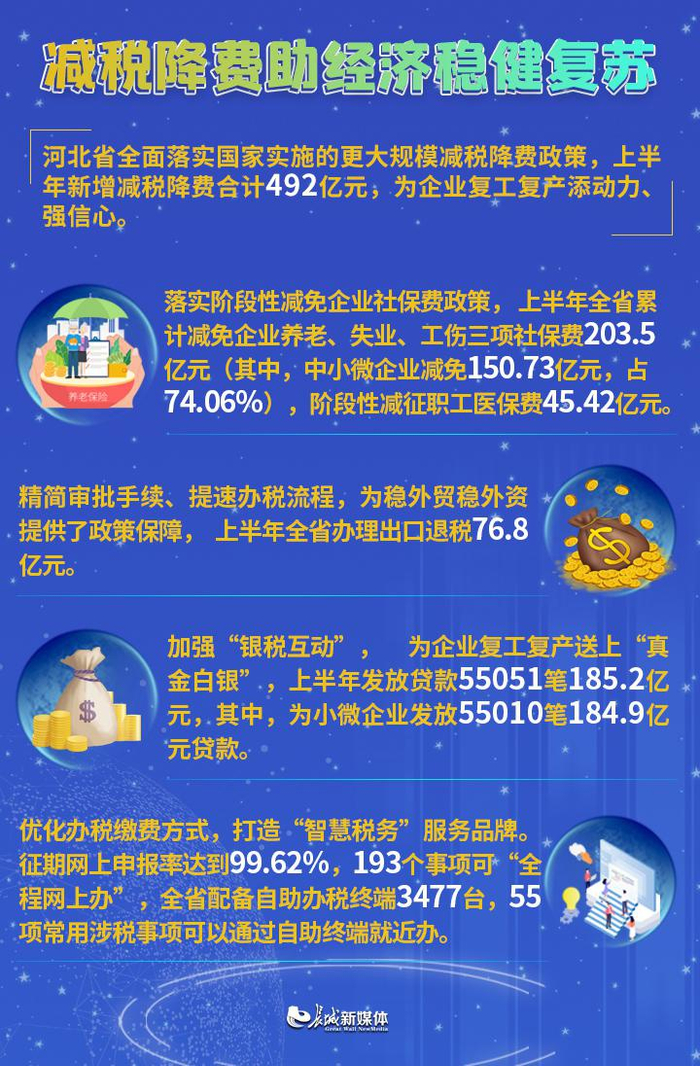据统计,河北省上半年新增减税降费额492亿元,为外贸企业办理出口退税76.8亿元,通过“银税互动”为企业融资185.2亿元,实现193个事项“全程网上办”。