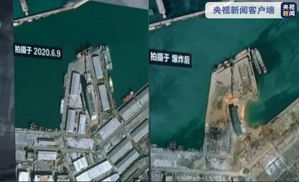通过卫星图片可以看出,爆炸前,仓库等建筑散布在港口区。爆炸发生后,同一片区域的绝大部分建筑物都被夷为平地,港口区成为一片焦土。