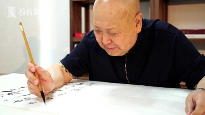 在录制“云上领读人”的时候,老爷子早早地就来到现场。由于当时灯光师正在布光,他就到一边的书桌旁,取出笔墨,写下了《蒿州行》。一边写,一边开心地和身边的工作人员说:“看来我还是把它背出来了。”