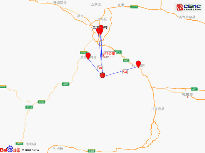 周边县城:震中距乌鲁木齐县34公里、距达坂城区54公里、距天山区63公里、距沙依巴克区64公里、距水磨沟区67公里,距乌鲁木齐市63公里。
