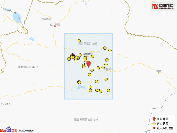 历史地震:根据中国地震台网速报目录,震中周边200公里内近5年来发生3级以上地震共89次,最大地震是2016年12月8日在新疆昌吉州呼图壁县发生的6.2级地震(距离本次震中126公里),按震级大小前50次历史地震分布如图。