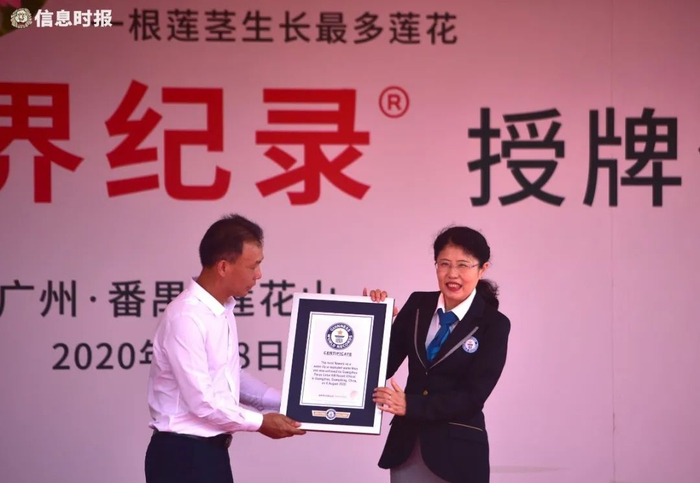 在活动现场,吉尼斯世界纪录认证官吴晓红代表官方宣布七蒂莲荣获“一根莲茎生长最多莲花”吉尼斯世界纪录称号,并向莲花山旅游区领导授牌。至此,2020年7月在广州番禺莲花山发现的七蒂莲成功获得一茎多花之世界桂冠,为广州番禺地区及第34届全国荷花展览、莲花山景区增添吉祥美好的文化符号和熠熠生辉的天然印记。