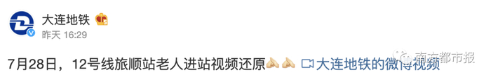 随后,下午16时29分,@大连地铁 再次发布微博,发出7月28日当天旅顺站老人进站视频。