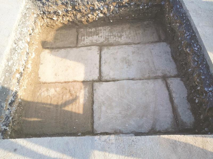 在古桥南端正中间位置,记者看到一个深约0.7米的方坑,坑里有七块青灰色的古石板,从部分石板上的沟纹可见其历史久远。而从坑的切面,记者看到了石板上被沥青、渣土、泥土等多层覆盖。
