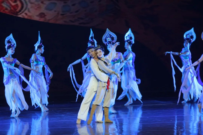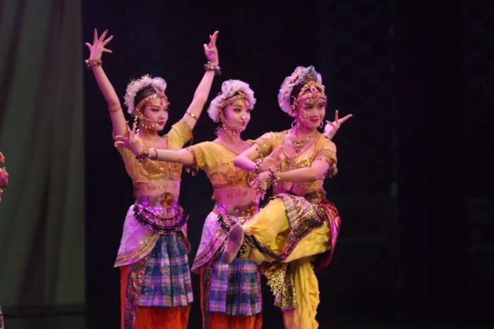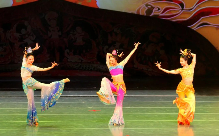 舞蹈演员们以观音造型亮相,十指纤纤,变幻造型,气势非凡的《金光千佛》让现场观众领略到敦煌舞蹈的大气;《丝路花雨》经典片段《反弹琵琶》,以及79版《丝路花雨》经典片段《印度舞》为观众带来异域风情;民族与芭蕾版双人舞《大梦敦煌》经典片段中,芭蕾舞版双人舞首次公开演出,5对“月牙”和“莫高”用扣人心弦的双人舞将缠绵唯美的爱情悲剧和敦煌幻丽的奇景完美交融,营造出梦幻般的情致和浪漫;尾声《大梦敦煌》片段《金飞天》,满台金色的飞天漫舞飘动,将莫高窟的辉煌灿烂、月牙泉的清纯秀丽极致展现。