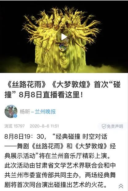 8月8日晚,“经典碰撞时空对话——舞剧《丝路花雨》和《大梦敦煌》经典展示活动”在兰州音乐厅精彩上演。3位“英娘”、5对“月牙”和“莫高”同台演出并与市民零距离互动,整场活动喝彩不断,市民直呼看得“过瘾”。