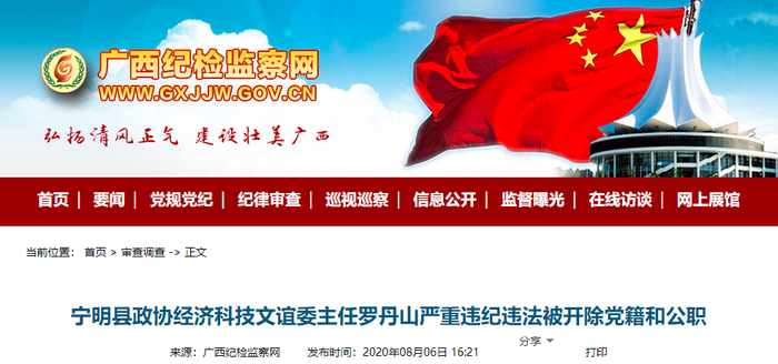 据宁明县纪委监委消息:日前,经宁明县委批准,宁明县纪委监委对宁明县政协经济科技文谊委主任罗丹山进行纪律审查和监察调查,并对其采取留置措施。