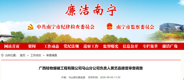 据马山县纪委监委消息:广西桂物爆破工程有限公司马山分公司负责人黄艺嘉涉嫌严重违纪违法,目前正接受马山县纪委监委纪律审查和监察调查。