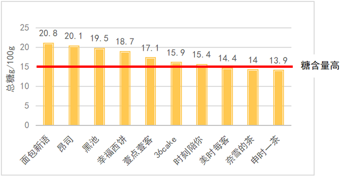 按照每人每次摄入一份蛋糕(115g),以10款蛋糕总糖平均值为19.5g测算,吃一份蛋糕,就基本要达到了的一天的最佳糖摄入量。