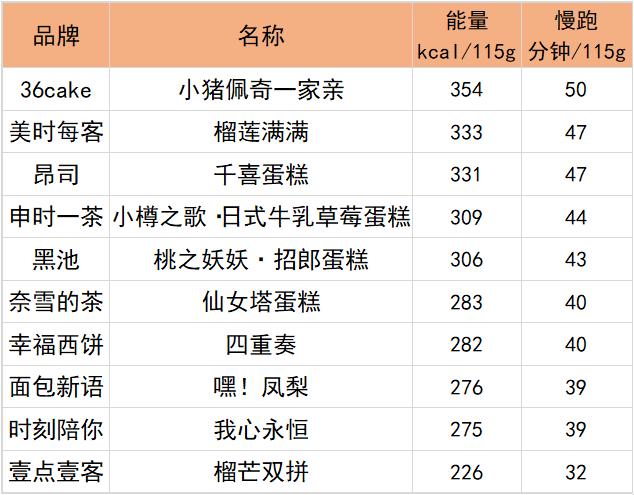 以慢跑每分钟消耗7.1kcal为例,列出相对应运动量消耗的能量。按这么算,10款蛋糕能量均值为297kcal/115g,吃一块蛋糕,平均需要慢跑42分钟才能消耗。