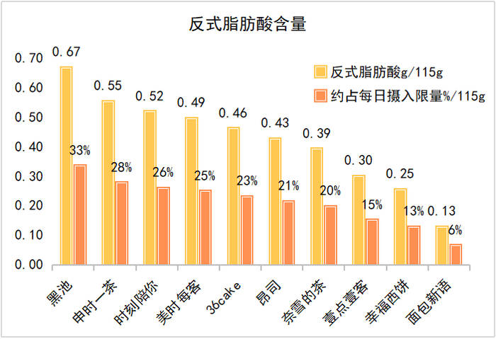 其中最高的是黑池-桃之妖妖·招郎蛋糕(0.58g/100g),如进食一份蛋糕(115g)会摄入反式脂肪酸0.67g,占每日反式脂肪建议摄取限量(2g)的33%。