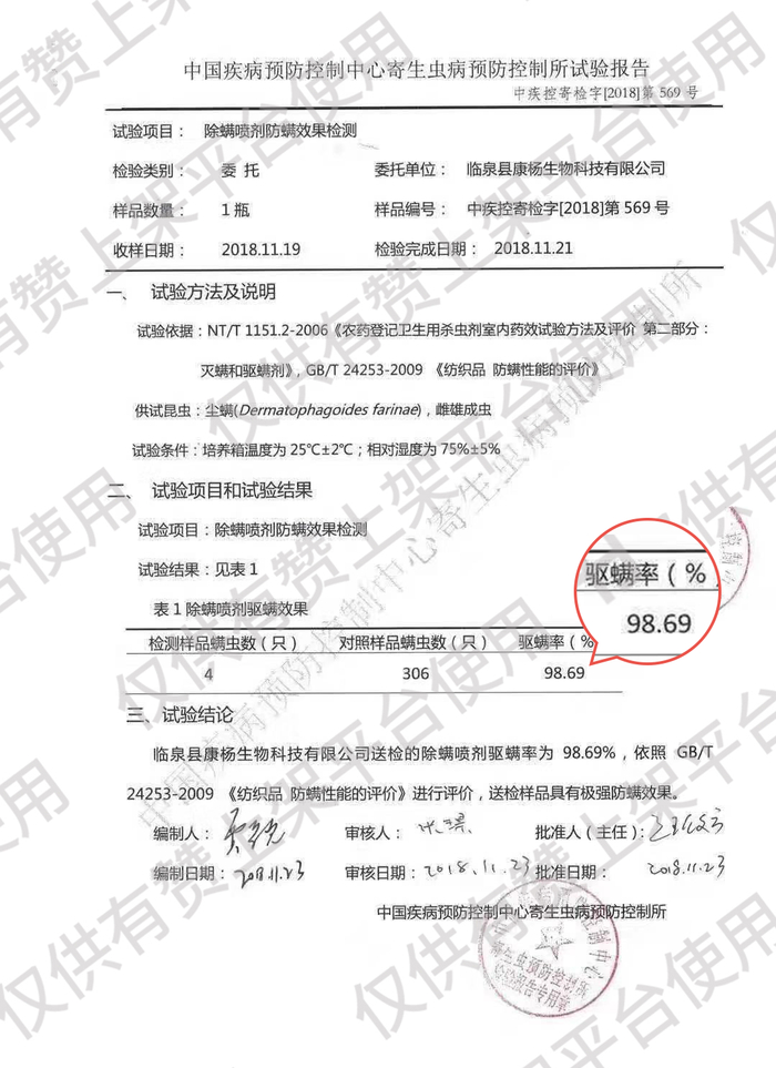 经过疾控预防控制中心检测,除螨喷雾剂的除螨抑螨效果达到了98.69%。