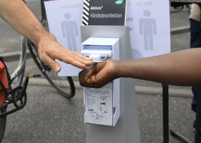 7月4日,在德国法兰克福“跳蚤市场”入口处,民众使用洗手液消毒。新华社记者 逯阳 摄