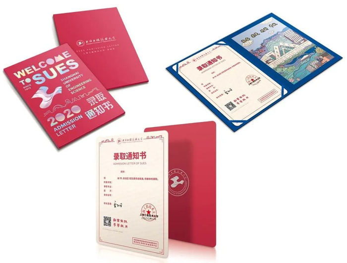 上海工程技术大学录取通知书采用“成功红”、 “炫彩银”、 “理想蓝”为主色调,象征着成功喜庆的气氛、绚丽多彩的新生活、海纳百川的精神,提取工程大标志性建筑相融合,运用装饰艺术的视觉表现风格,体现了工程大的深厚文化底蕴,具有纪念意义和收藏价值。每份录取通知书内附有两张新生专属校园风景“盲盒明信片”——“致亲爱的家人” 和“致四年后的自己”,对新生学子来说,既是感恩教育,亦是生涯教育。