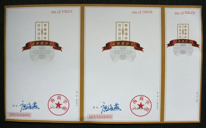 上海商学院录取通知书的设计创意来源于成语金榜题名。鲜红的封面代表着无限的希冀和光明的未来,内页是校训和上海商学院防伪图案的结合元素。
