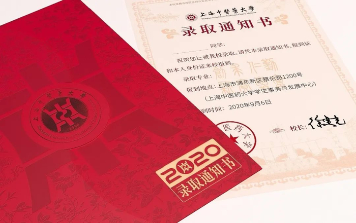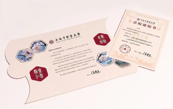 上海中医药大学录取通知书采用上中医“校徽红”凹凸印封套配以烫金字样,内封淡雅清新点缀校景、杏花、祥云等元素,同时巧妙地将校徽图案与古典盘扣、阴阳鱼设计融为一体,寓意相扣相承,中西合璧,灵动不失内敛,庄重又具温馨。