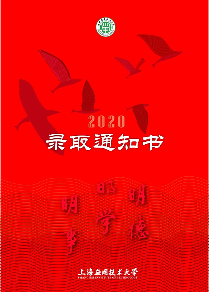 上海应用技术大学2020年版录取通知书的设计主题是“鲲鹏展翅”。通知书正面一组是鲲鸟展翅飞翔,寓意着学子们即将开启新的征程,朝着更高更远的方向勇攀人生巅峰。红色背景表达着热烈与喜悦,层层叠加的波浪线代表着知识的海洋。背景里波浪线元素与上应大校门的图景交叠,交相辉映。当然,最能证明这是上应大货真价实、独一无二的录取通知书的,是敬爱的柯校长大气的签名和上应大鲜红的印章!