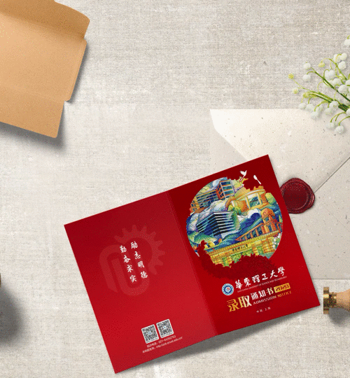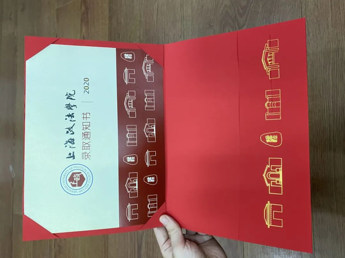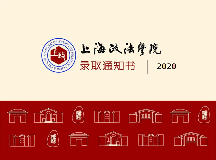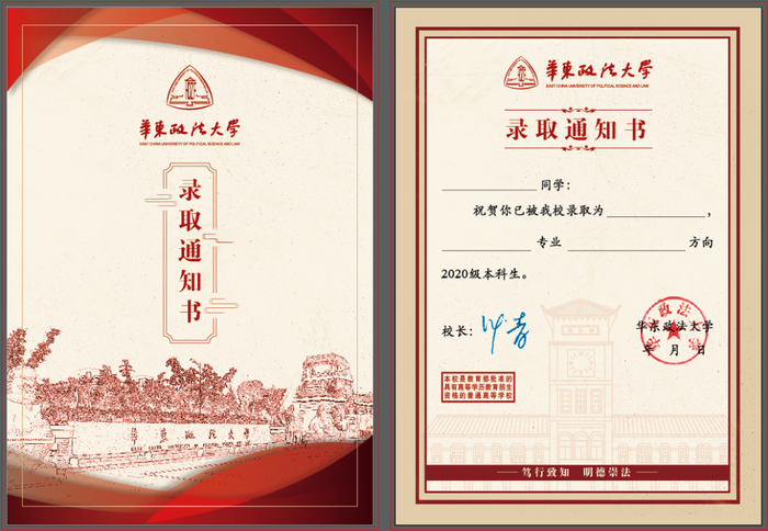 华东政法大学录取通知书以华政红为主基调,包含着松江校区校门、长宁校区标志性建筑韬奋楼、校训等华政元素,以华政主建筑为背景,古朴而庄重,代表着华政的深厚文化底蕴,红色表达了对新生的欢迎和祝福。