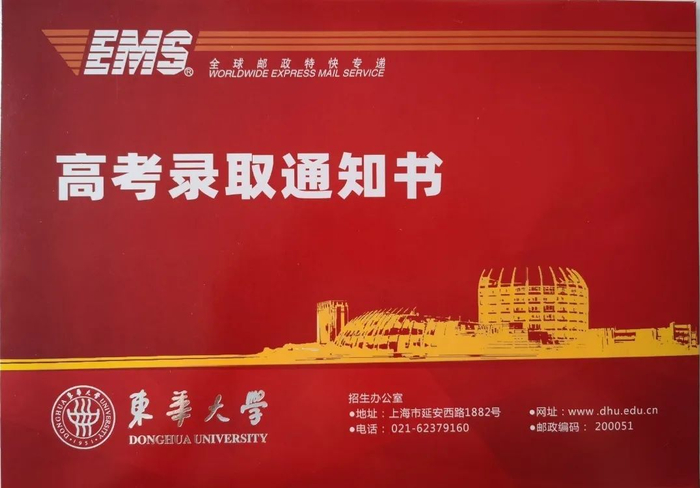 红艳艳的EMS外壳,预示着红红火火充满希望的开始,上海师范大学录取通知书背面学位帽的设计预示着新生未来几年为之奋斗的目标。学校校徽、校训、标志性建筑一教彰显着历史的韵味。