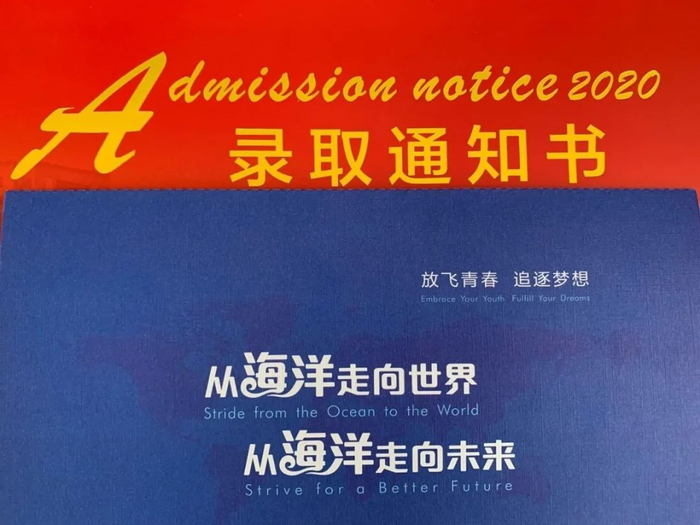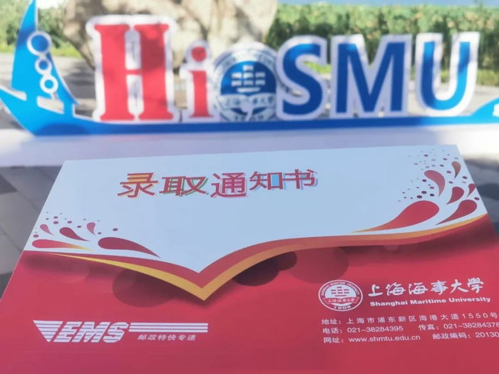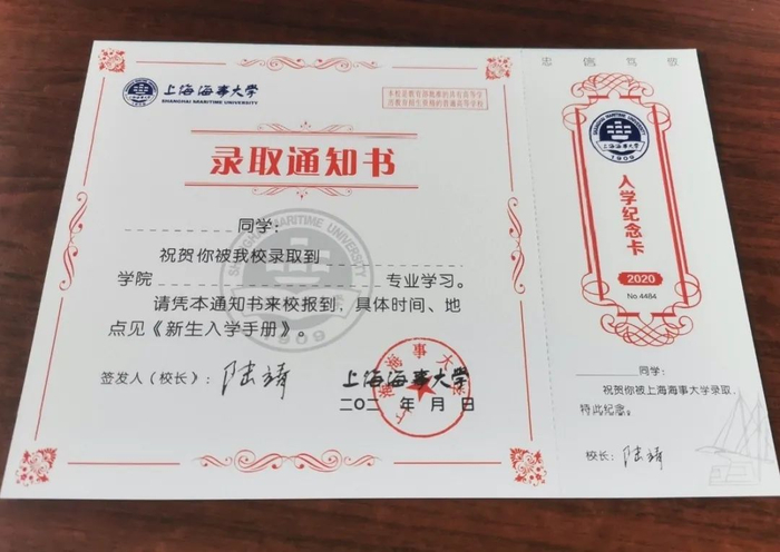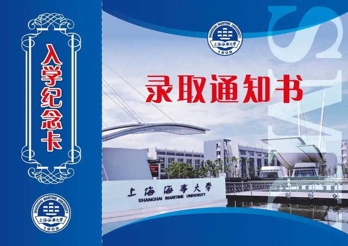 上海海事大学录取通知书以红色和蓝色为主题色,其中红色象征了光明、激情,是青年独具的美好品格;蓝色代表着大海,上海海事大学因海而生,中国航运向海而强。
