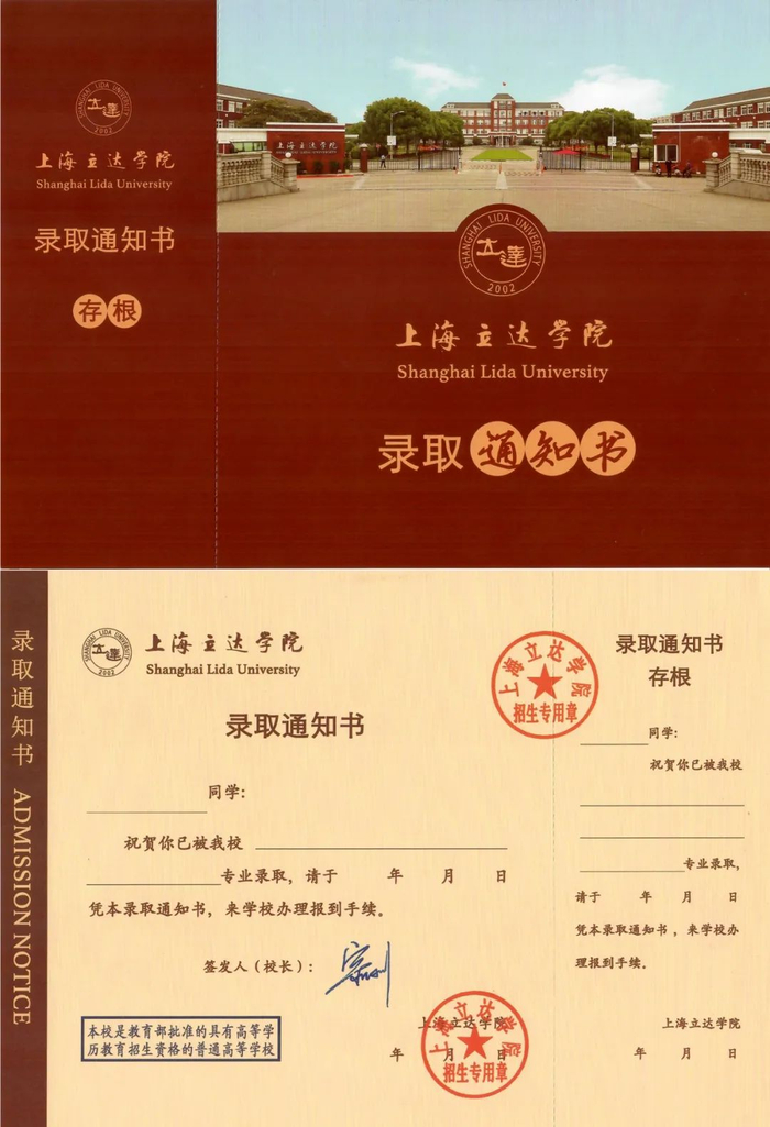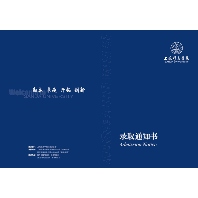上海杉达学院录取通知书印有校名校标、校训、校长签名、联系方式等文字,以及金海校区图书馆和教学群楼侧影、嘉善校区图书馆和理念石水印图案,整体设计显得正规、大方,象征着永恒、希望,在未来四年的每一个时刻,杉达都将与你同行、伴你成长。