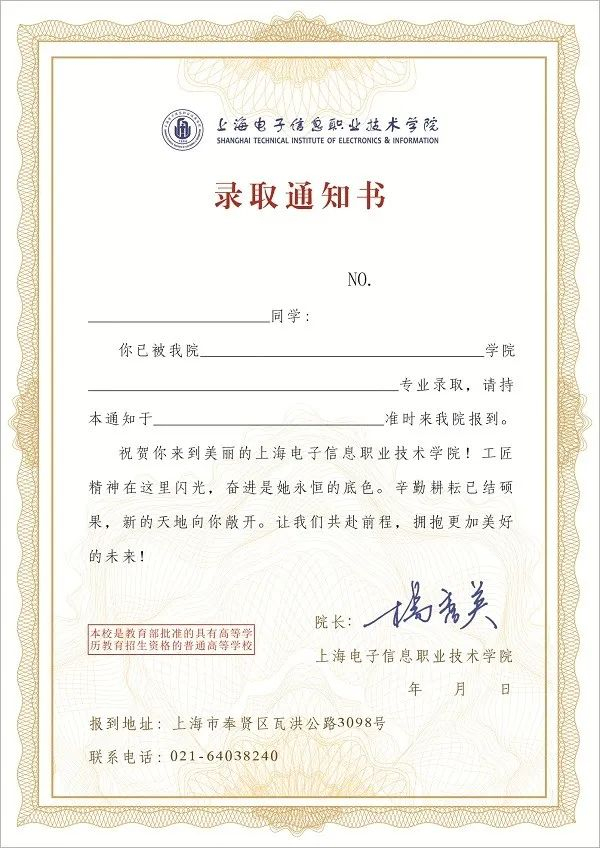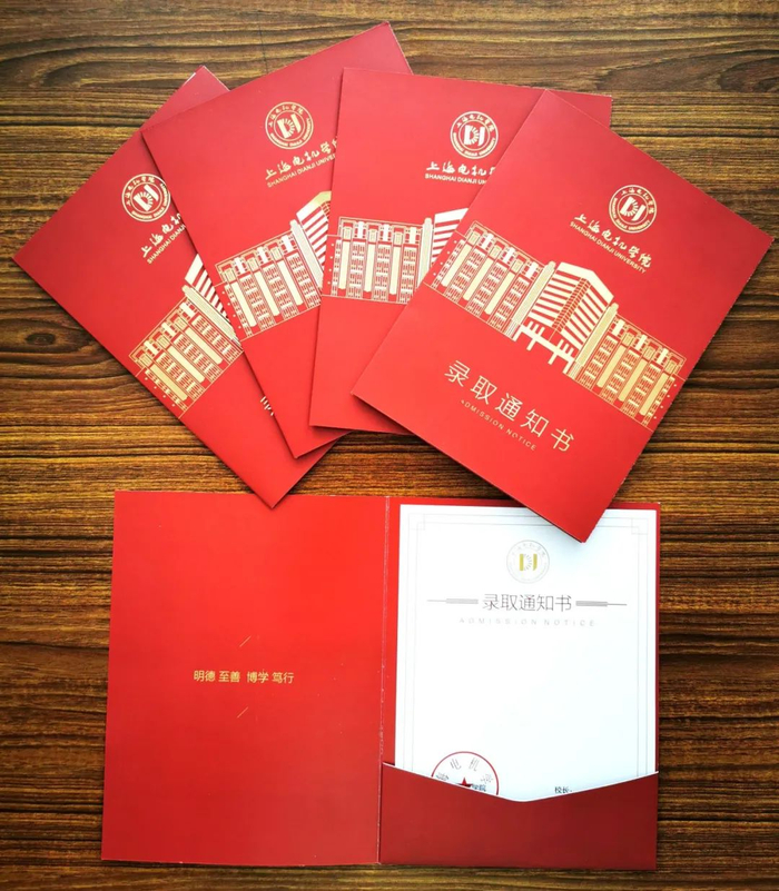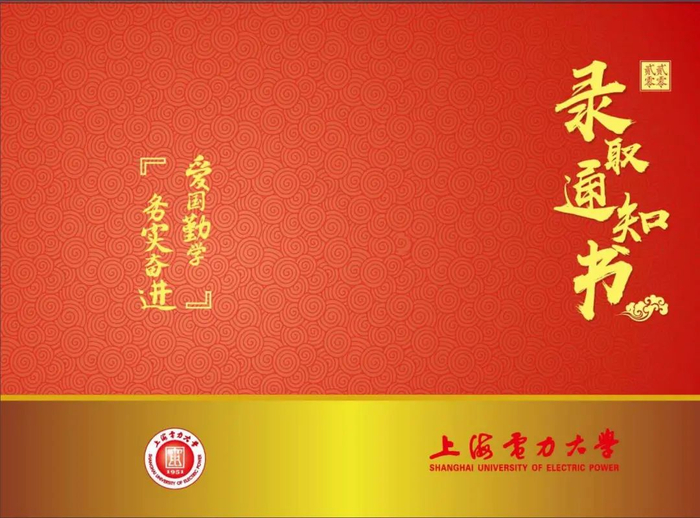 上海电力大学本科生录取通知书中金色和红色的碰撞,传递着喜悦与自豪;素雅清丽的色彩下,临港校区跃然纸上。捷报踏着祥云,好运乘着清风,祝愿上电的新生们鹏程万里!