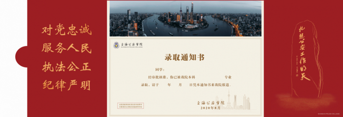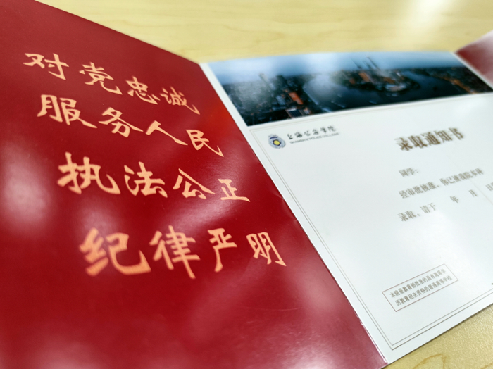 上海公安学院录取通知书本体双折三开面,合上后近似方形、搭配开合的设计如一扇通往公安事业的大门,内页两侧分别是“四句话、十六字”和校训石,彰显公安学院的精神气蕴。