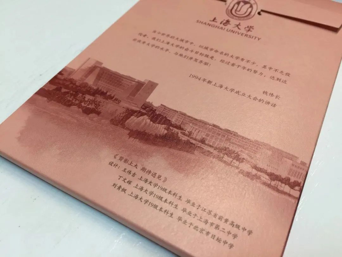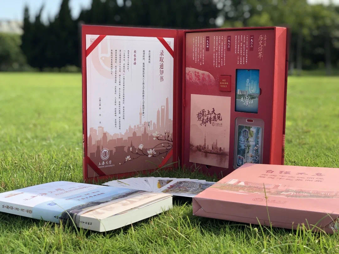 上海大学2020级新生录取通知书以红色为主基调,采用“开启”式设计,内容不仅包括有明信片和专属U盘,更有新生纪念版校徽盲盒。盲盒共有九个颜色,分为三大色系主题。分别是:上大专属VI设计的蓝白灰、代表上大特色文化的红蓝绿和象征上大不同美景的黄红粉。如果能集齐不同色系的校徽,还可以在开学的时候兑换好礼!