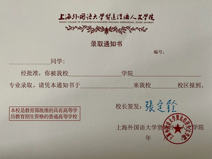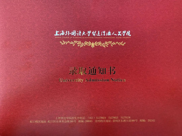 上海外国语大学贤达经济人文学院录取通知书寓意:开启世界名校大门的金钥匙。