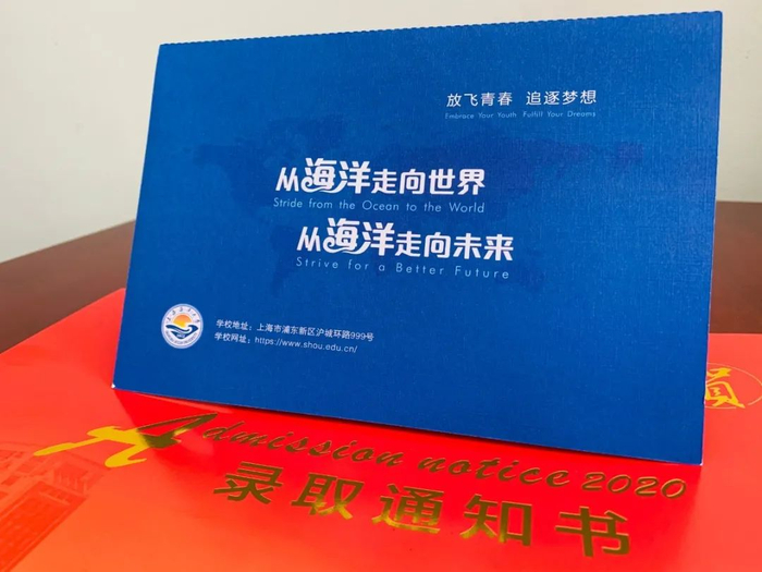 上海海洋大学录取通知书采用象征海洋的宝蓝色为底色,封面印着的是“淞航”号,它是国内首艘远洋渔业资源调查船,通知书的封底写着“从海洋走向世界,从海洋走向未来”,体现着上海海洋大学新时代的发展格局。