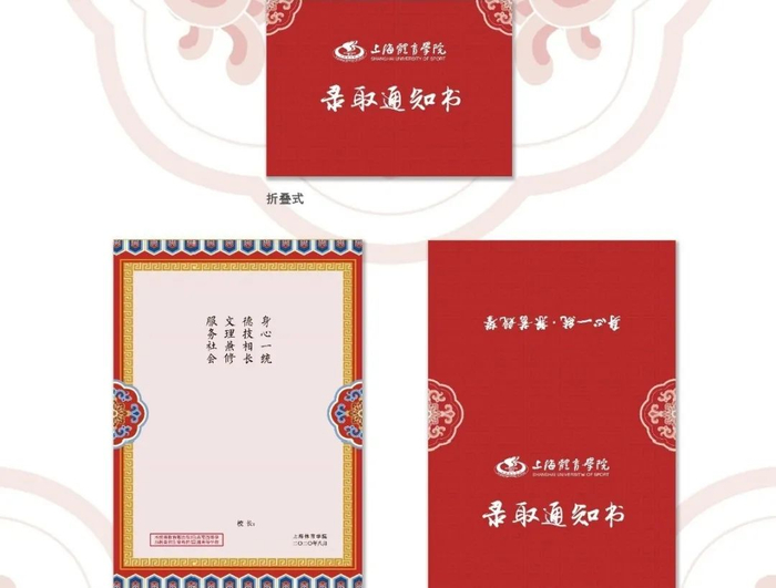 “承载”着绿瓦大楼的通知书——上海体育学院本科录取通知书采用古风设计,以上海体育学院核心主楼——绿瓦大楼的彩绘花纹为灵感,封底印有校训“身心一统,兼蓄竞攀”,告诫学子循身心一统之思想,展兼蓄竞攀之气度。