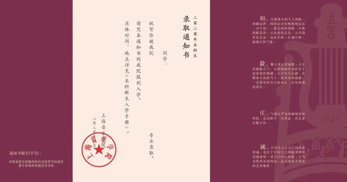 上海音乐学院录取通知书体现出拥有93年历史的上海音乐学院深厚的艺术积淀和文化传承,设计元素运用上海音乐学院校训“和毅庄诚”及涵义解读,希冀新生力量在入学前充分了解上海音乐学院的精神之基,以此激励新生做人要正直刚毅,树立追求理想追求真理的艺术信念。