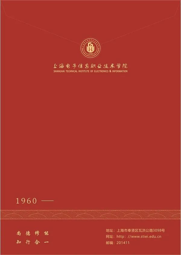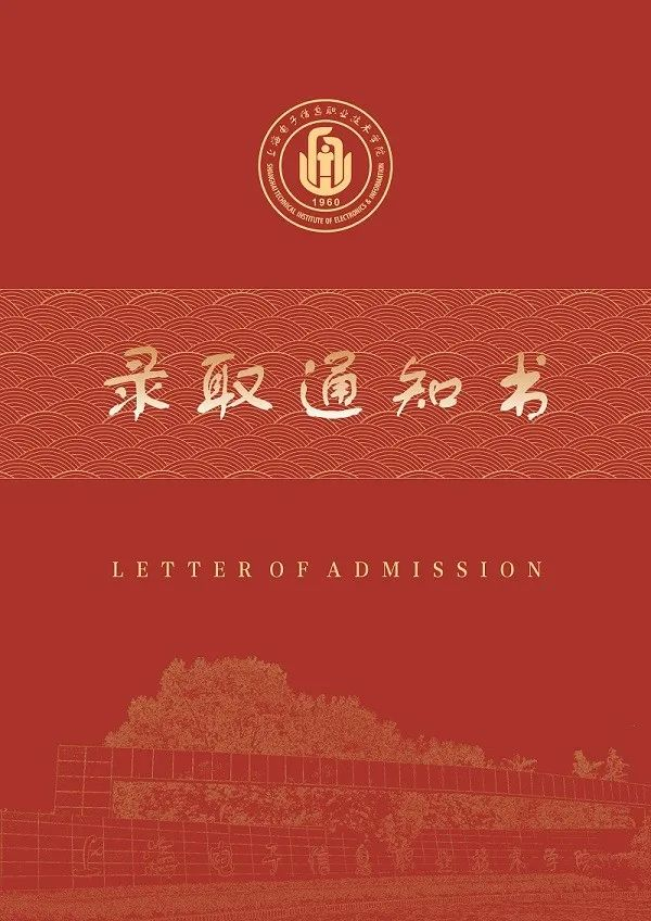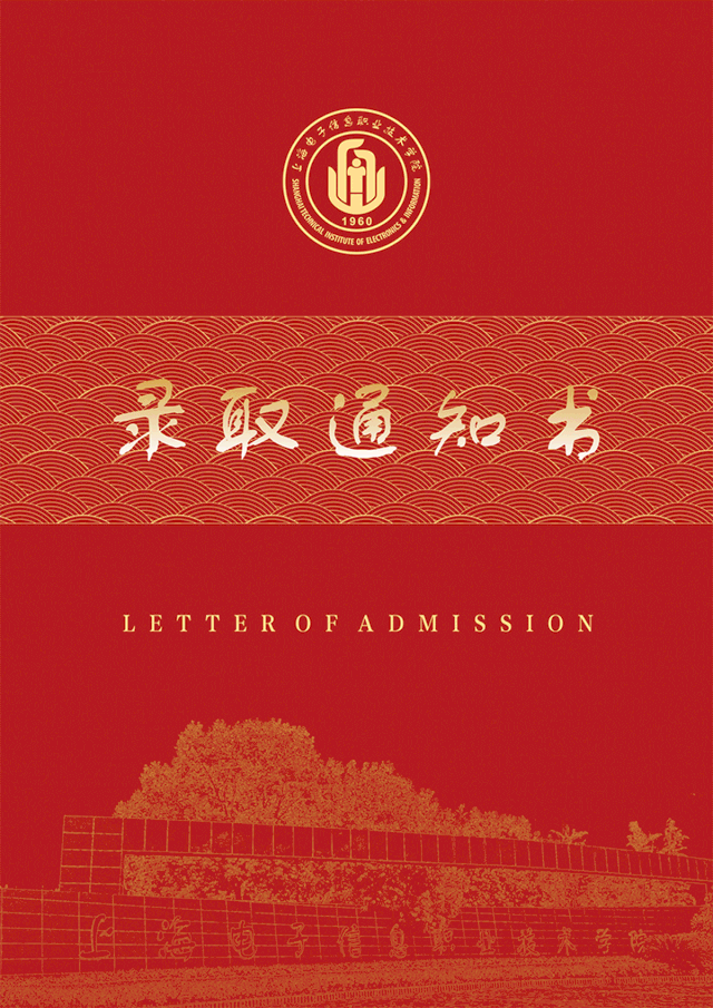 上海电子信息职业技术学院录取通知书特色:图案简洁素雅,寄语催人奋进、传递工匠精神;红色信封喜庆庄重,校门与校训首尾呼应,如同新生进校至学成毕业全程的缩影。