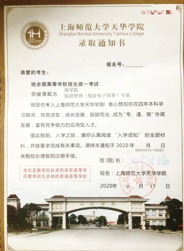 上海师范大学天华学院的录取通知书整体以棕色为主基调,同时加入了校名、校徽等元素,沉稳大气。底部以天华学院的大门为背景,“天华学院”四个大字熠熠生辉,敞开的大门也表示着对新生的期待与欢迎。