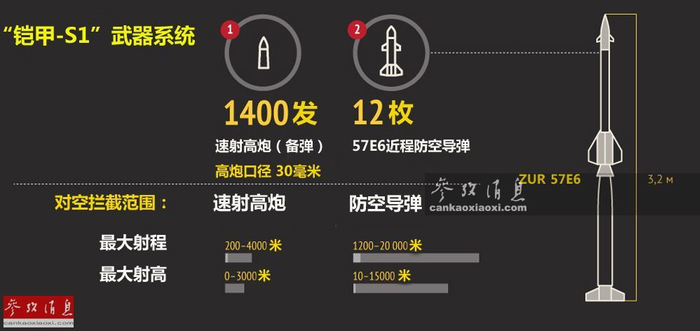 此外还搭载有用于拦截远程目标的12枚57E6近程防空导弹,最大射程20千米,最大射高15千米,可拦截以3马赫高速接近的高空或低空目标。与传统防空系统不同,“铠甲-S1”的最大特点是可以时速30公里(柏油路)行进中,同时使用导弹和速射高炮攻击4个不同目标。(3个采用雷达制导,1个使用光电制导)