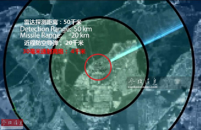 “铠甲-S1”车载雷达可覆盖半径50千米的探测范围,其武器系统包括用于拦截近距离目标的2门2A38M型30毫米速射高炮,射速每分5000发,弹药基数1400发,可使用杀伤破片弹、穿甲弹和高爆燃烧弹等3种型号的炮弹,最大射程4千米,最大射高3千米。图为“铠甲-S1”系统的车载雷达及防空导弹、速射高炮覆盖范围示意图。