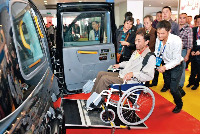 参观者在第七届中国老年产业博览会上体验英伦无障碍车
