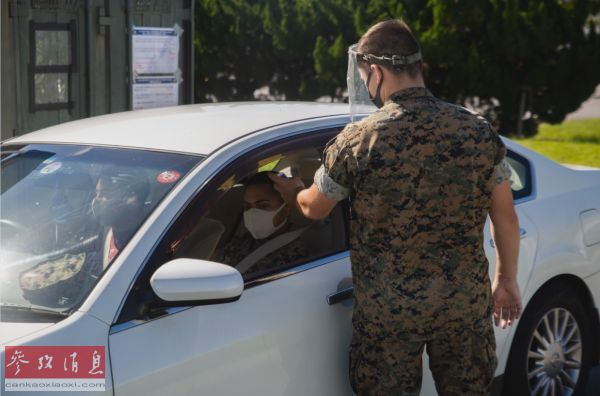 美海军陆战队士兵7月20日在冲绳汉森兵营门口对入营人员进行体温检测。(美国防御视觉信息分发服务网站)