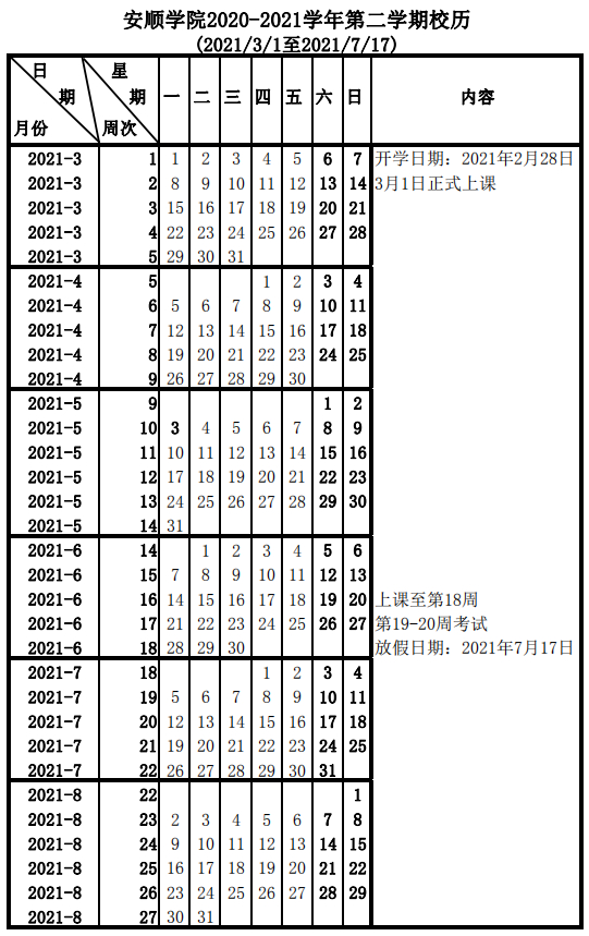 2020-2021学年第一学期从2020年8月31日开始,8月29日教职工报到,29日、30日学生报到,31日正式上课,2021年1月17日结束,共20周,19周考试。