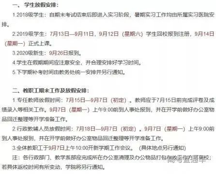 2.教职工2020年7月20日(星期一)至9月2日(星期三)放假。9月3日(星期四)正式上班,放假期间,有工作任务的单位根据实际情况自行安排串休。