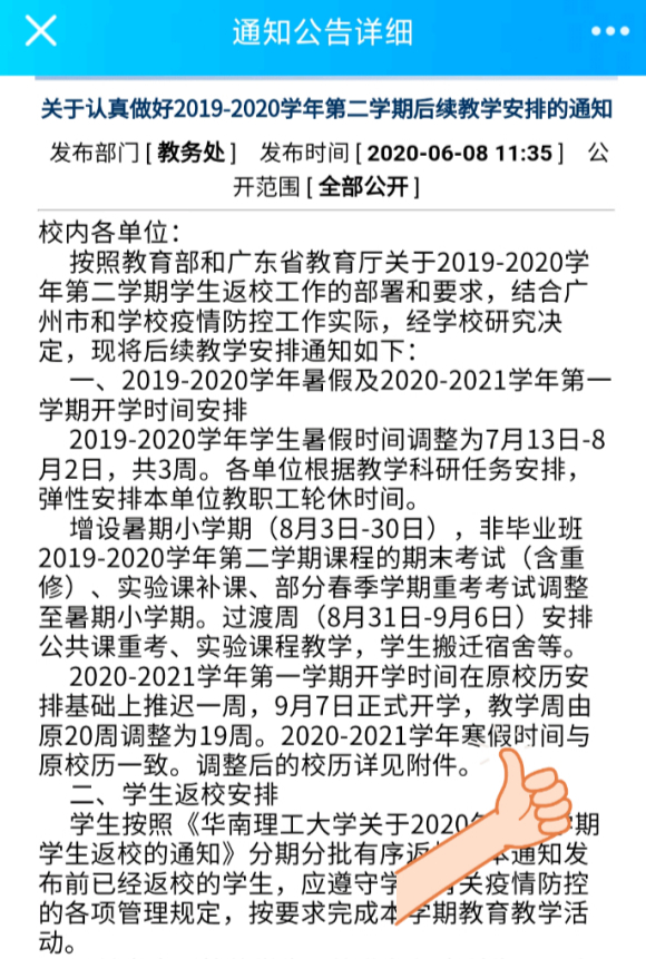 经学校同意,2019—2020学年第二学期结束时间延迟到2020年7月24日,暑假时间从2020年7月25日至9月8日,2020—2021学年第一学期从2020年9月9日开始。