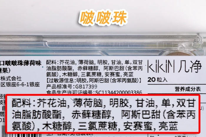 我国要求配料表要按成分含量高低依次排列。在啵啵珠的成分列表里面,薄荷油排到了第二位,如此高的含量,口气想不清新都难!