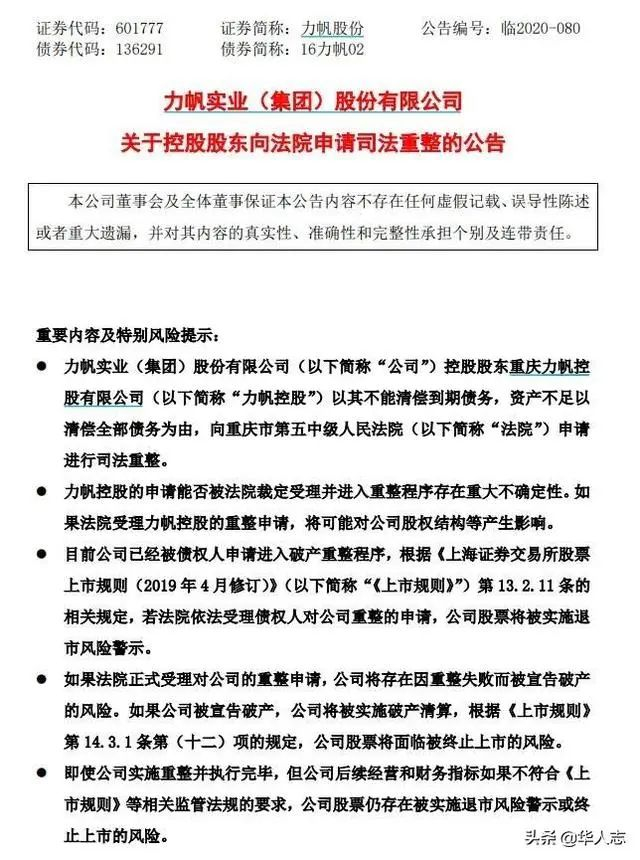 目前该公司已经被债权人申请进入破产重整程序,根据《上市规则》等相关规定,若法院依法受理债权人对力帆控股的重整申请,公司将存在因重整失败而被宣告破产的风险。如果公司被宣告破产,公司将被实施破产清算,其股票将面临被终止上市的风险。